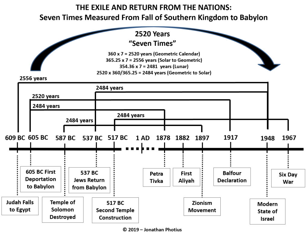 We can see that “seven times” exactly pass over a 390-year cycle from the Assyrian Scattering in 744 BC until 1948 for the Northern Kingdom. This timeline ends and converges to the same year that the Southern Kingdom of Judah returns from exile a second time measured from Cyrus 537 BC decree based on a 360-year “seven times” cycle, also to 1948. In addition, we see three convergences to 1967 measured from “seven times” from King David’s reign in Jerusalem based on a 430-year “seven times” cycle, converging at the same time as the 724-BC “seven times” fall of the Northern Kingdom to the Assyrians ending in 1967 AD based on a 390-year calculation.  Also converging from the “seven times” return from Babylon and the second temple construction in 517 BC, we have a 360-year cycle terminating also in 1967 AD.  1967 AD is a significant fulfillment of bible prophecy in that Jerusalem was “liberated” by the gentile rule for the first time in over 2500 years.  From King David to the Six Day War, SEVEN TIMES passed over the land until Jerusalem was free once again!
