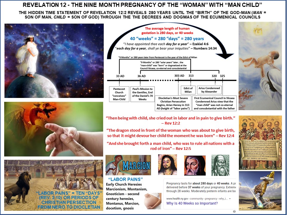 On the day of Pentecost (and/or after the resurrection of Christ), the church “conceived” the idea that Jesus was both God and Man. Approximately “40 weeks” of year later, or 280 solar years, the Church’s labor pains (of persecutions and heresy) end with the Edict of Milan. At the same time period in history the “Woman/Bride” also gave birth to the dogmas and decrees of the God-Man/”Man-Child” through the First Ecumenical Council to defeat the heresy of Arius, who as an instrument of the Red Dragon attempted to devour the young “man-child”/God-Man the moment he was born/dogmatized. This event took place immediately after the completion of the 280 years of labor pains of the church struggling through 10 major persecutions and and gnostic heresies.