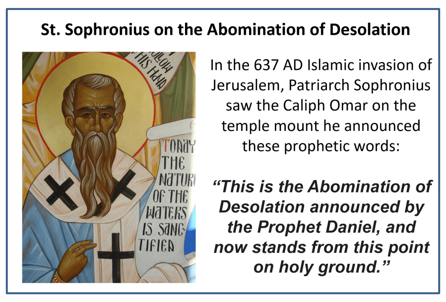 2. Matthew 24:15 identifying the Abomination of Desolation in the Olivet Discourse to Mohammed (this is in agreement with Patriarch Sophronios of Jerusalem in 637 AD).