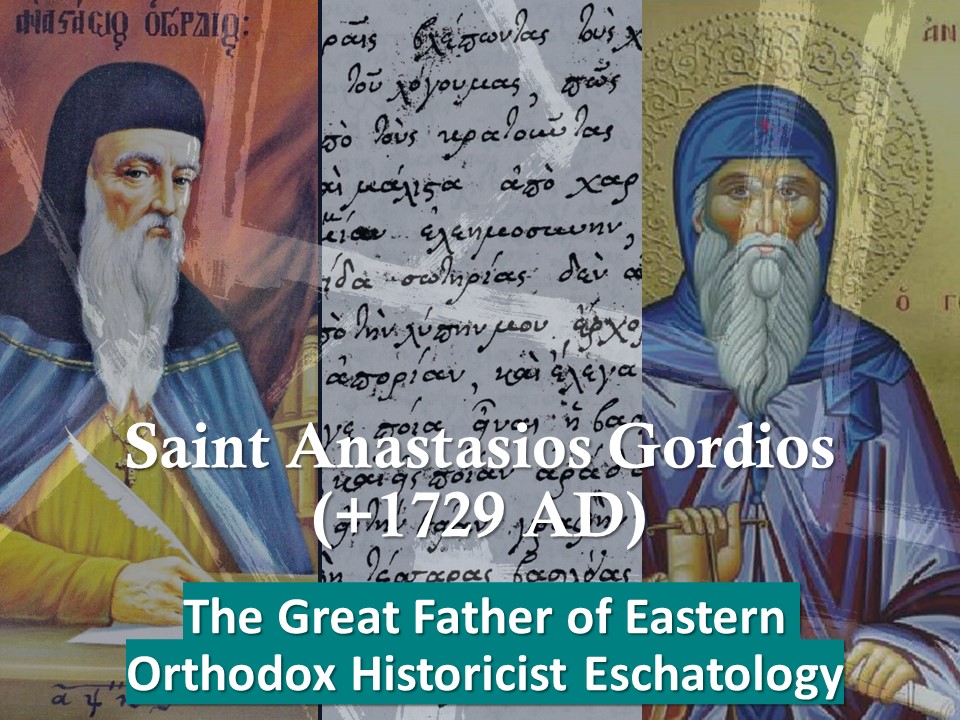 However, We find other later Greek commentators like Athonite monk Theodoret of Ioannina, Apostolos Makrakis, and Athonite Monk Neilos Sotiropoulos were all major advocate and proponent of the year/day method of interpretation. Back when I republished Makrakis’s Revelation commentary in 2018, I called him the “Father of Eastern Historicism” as I made the mistake to assume that he was the first Orthodox to write from a historical perspective. But now we have evidence of over 20 existing Greek Orthodox historicist commentaries written in the 17th through the 19th centuries. There were a few Orthodox commentaries in the 1600s which began to sew the seeds of historical applications to the Apocalypse, but they were just starting to crack open the door, and Gordios took their ideas and kicked the door wide open. I now retract my initial statement and belief on the roots of historicist approach in Orthodoxy, to say that it is otherwise Saint Anastasios who is clearly one of the first major author’s of these historicist ideas coming from the Eastern Church. And as such, Anastasios Gordios is indeed considered to be one of the major “Fathers of Eastern Orthodox Historicist Eschatological Thought.”