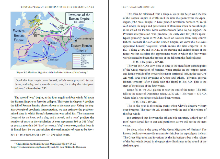 *** Note by Jonathan Photius I must confess I find this application of the times statement in Revelation 9:15 fascinating, given this idea was developed by Metropolitan John in the 1700s. Makrakis in 1881 took this idea further to describe the release of the four winds to bring about the Great Barbarian Migration of Nations which resulted in the fall of Rome in 476 AD. The great migrations began around 375 AD, very close to Metropolitan John’s calculation of 360 AD. I took Makrakis’s interpretation of the “hour/day/month/year” times statement a bit further and applied it to the range of dates foretelling the rise and fall of the “restrainer” and Daniel’s Fourth Beast (Rome) starting with the rise of the Roman Empire in 27 BC until the fall of Gaul in 476 AD. Thus this mysterious times statement of Revelation 9 predicts the 391 years after John wrote Revelation to show the birth of the Roman Empire through to it’s completion and fall of Rome’s power. The killing of a “third of men” was the result of war and pestilence (i.e. Justinian Plague) which killed off over a third of Europe’s population, but we can take the allegorical approach to the text one step further and apply the fact that the Barbarian tribes brought with them form of Arianism which would result in the schism and Reformation thanks to the addition of the Filioque causing the spiritual deaths for one-third of Christendom. As Revelation 9 reveals the Western nations never repented of the Arianism which plagued the church for “5 months” (Rev 9 Fifth Trumpet), and it would lead to catastrophic consequences within the church. With the restrainer (Rome) out of the way, conditions were now ripe for the rise of the Papal and Islamic beasts of Revelation 13. Below you will find the excerpt analyzing the times statement of Revelation chapter 9 verse 15 from my book “The Encyclopedia of Christianity in the Book of Revelation.”