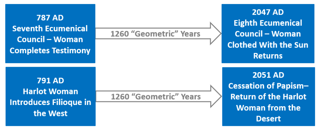 *** Note by Jonathan Photius: The Metropolitan’s calculation above showing the possible year for the prophesied “Eighth Ecumenical Council” was very impressive for Metropolitan John Lindios of Myra to conceive. This is similar to the “flight of the Orthodox Woman” set to occur after the Seventh Ecumenical Council. So the similarly we can start the calculation from the Seventh Council in 787 AD. And thus 1260 years from 787 AD = 2047 AD, when the true bride returns from the monastic wilderness for the “wedding feast of the Lamb”. So calculating 1260 years from the introduction of the Filioque is ingenious on the Metropolitan’s part.
