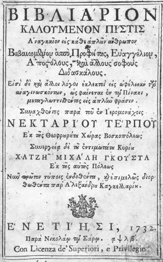 - Τέρπος, Νεκτάριος. Βιβλιάριον καλούμενον πίστις, 438 pages, 1732.