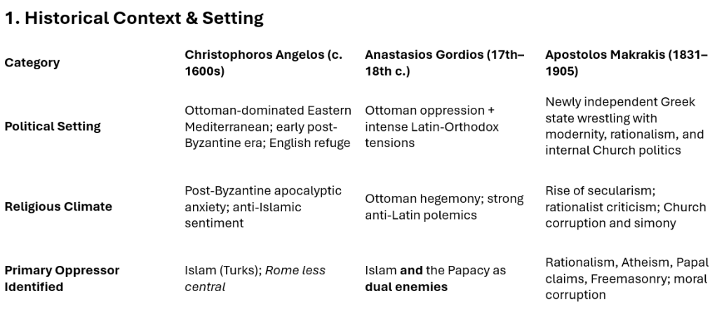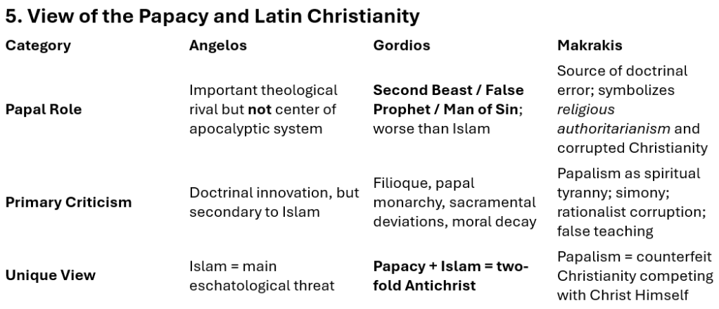This bifurcation allowed Gordios to integrate two longstanding enemies of Orthodoxy—Ottoman political domination and Latin ecclesiastical claims—into a unified eschatological framework. For Gordios, the Papacy poses a greater danger than Islam, because its deception is spiritual, not merely political.⁴ Islam persecutes the body; the papacy, through doctrinal corruption and pretensions to divine authority, threatens the soul. The convergence of these two forces constitutes, for Gordios, the full manifestation of Antichrist in history.