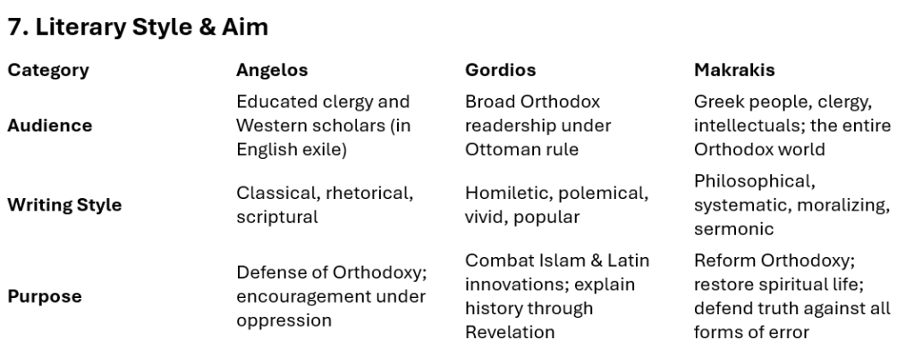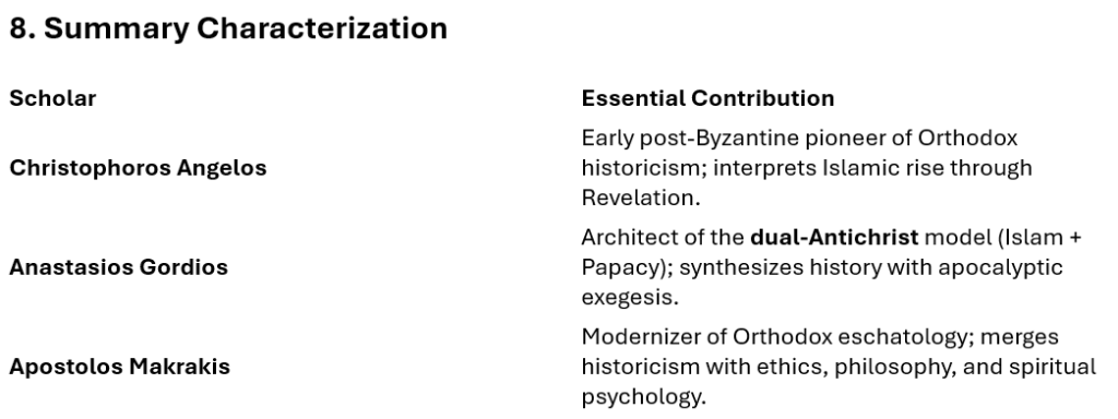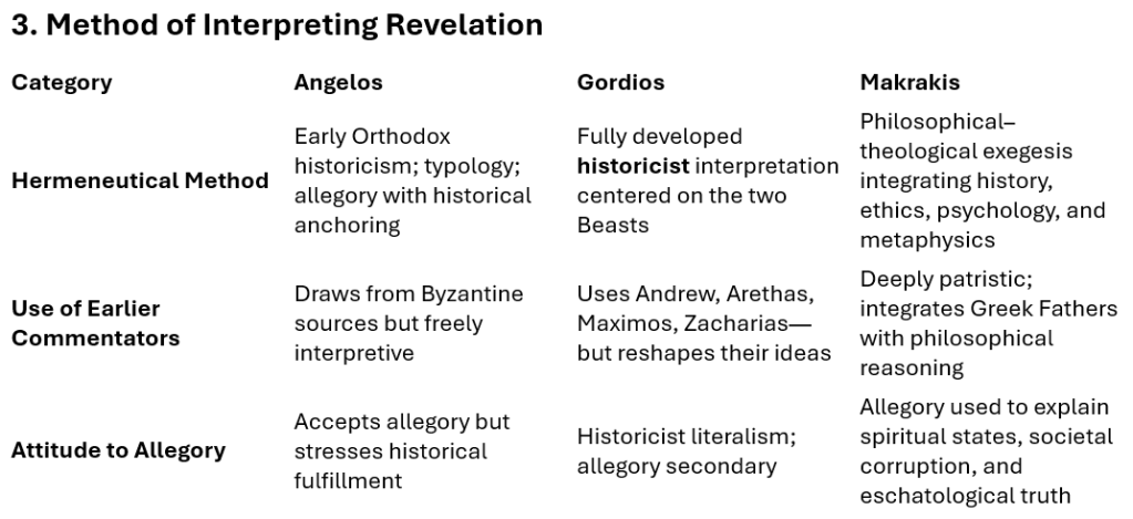 The impact of Gordios’s Treatise cannot be measured solely through manuscript transmission but through its influence on later interpreters, including Pantazēs of Larissa, Jean of Myra, Theodoret of Janina, and Kyrillos Lavriotēs⁸ and Apostolos Makrakis. For these authors, Gordios provided the scaffolding on which to build their own historicist readings of Revelation and their understanding of Orthodoxy’s eschatological struggle.