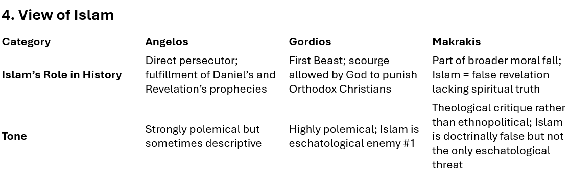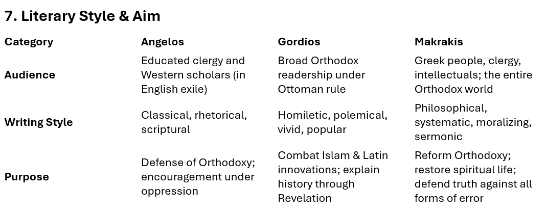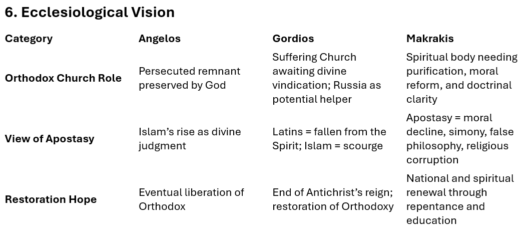 The impact of Gordios’s Treatise cannot be measured solely through manuscript transmission but through its influence on later interpreters, including Pantazēs of Larissa, Jean of Myra, Theodoret of Janina, and Kyrillos Lavriotēs⁸ and Apostolos Makrakis. For these authors, Gordios provided the scaffolding on which to build their own historicist readings of Revelation and their understanding of Orthodoxy’s eschatological struggle.