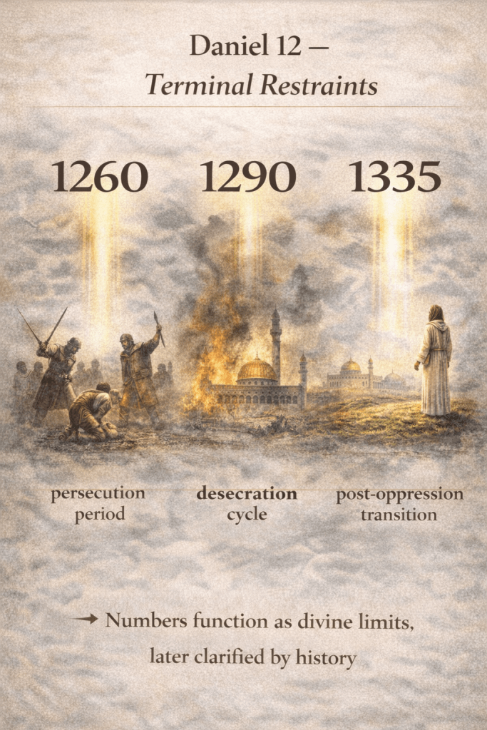 | Daniel 12 | Fixed divine limits on oppression | 1260 / 1290 / 1335 as terminal markers |