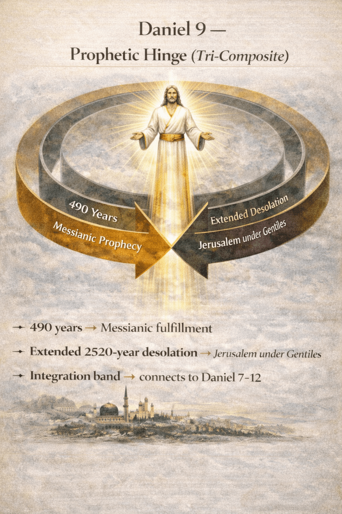 | Daniel 9 | Christological fulfillment + continued desolation | Tri-composite prophecy (490 + 2520) |