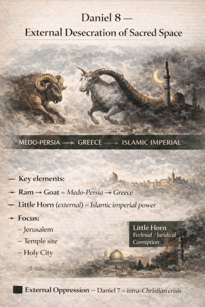 | Daniel 8 | External imperial oppression (Islamic power) | Same, with long-duration fulfillment |