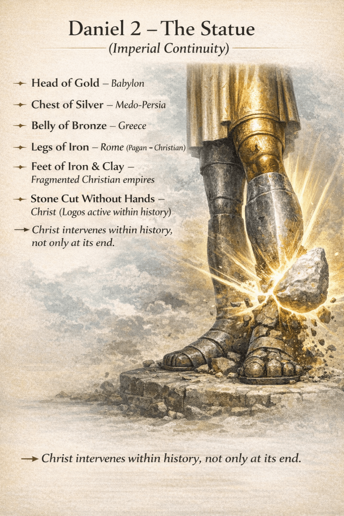 | Statue (Dan 2) | Succession of world empires culminating in fragmented Christian rule | Emphasis on continuity, not rupture |