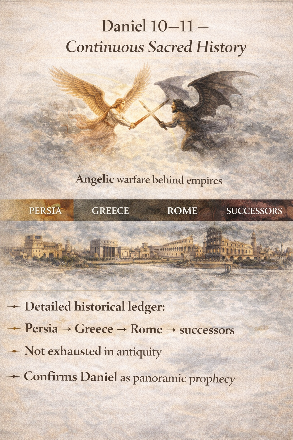 | Daniel 10–11 | Continuous sacred history guided by angelic powers | Panoramic, not exhausted |