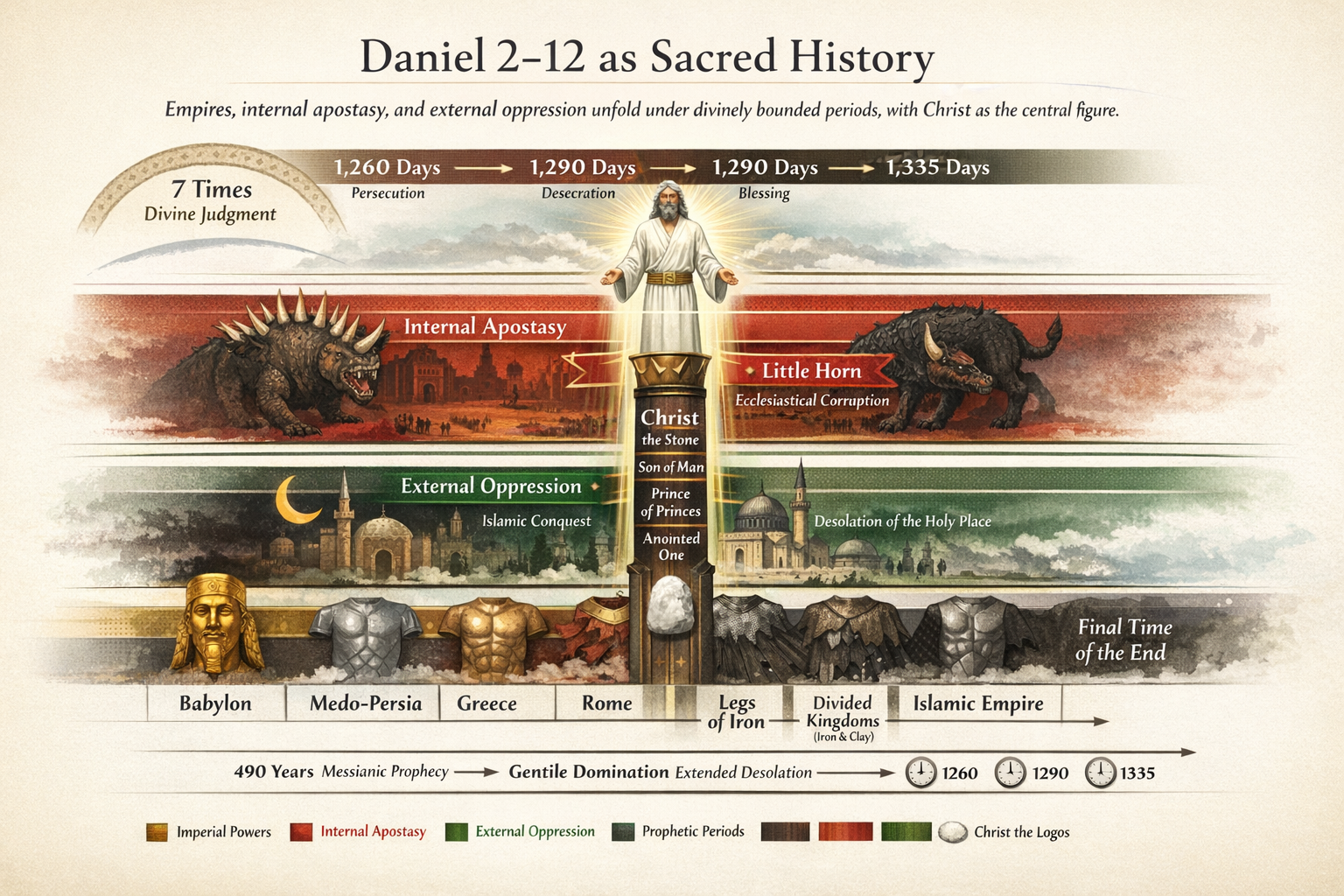 | Four Beasts (Dan 7) | Pagan Rome → Christianized Rome → fragmented Christendom | Beasts = civilizational systems |