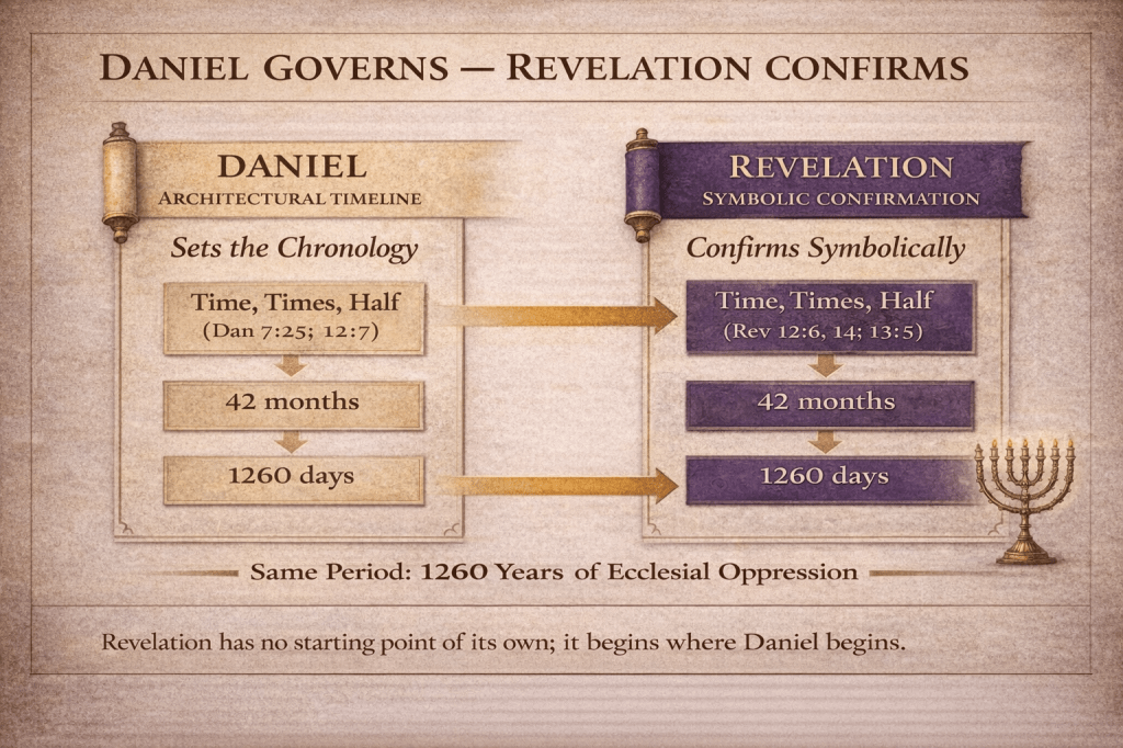 A central component of Sotiropoulos’ historicism is his explicit identification of the 1260-year prophetic period as the primary chronological bridge uniting Daniel and the Apocalypse. He insists that Revelation introduces no independent calendar, but presupposes the starting point already supplied by Daniel.⁸