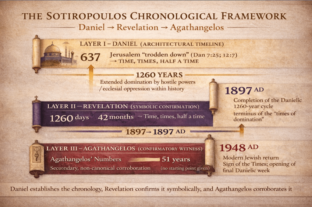 Throughout this discussion, Sotiropoulos maintains a clear methodological hierarchy: Daniel establishes the chronology, Revelation confirms it symbolically, and Byzantine prophecy corroborates it secondarily. Private prophecy is never permitted to govern Scripture, but may function as historical testimony when it converges coherently with biblical chronology and lived ecclesial history.¹⁵