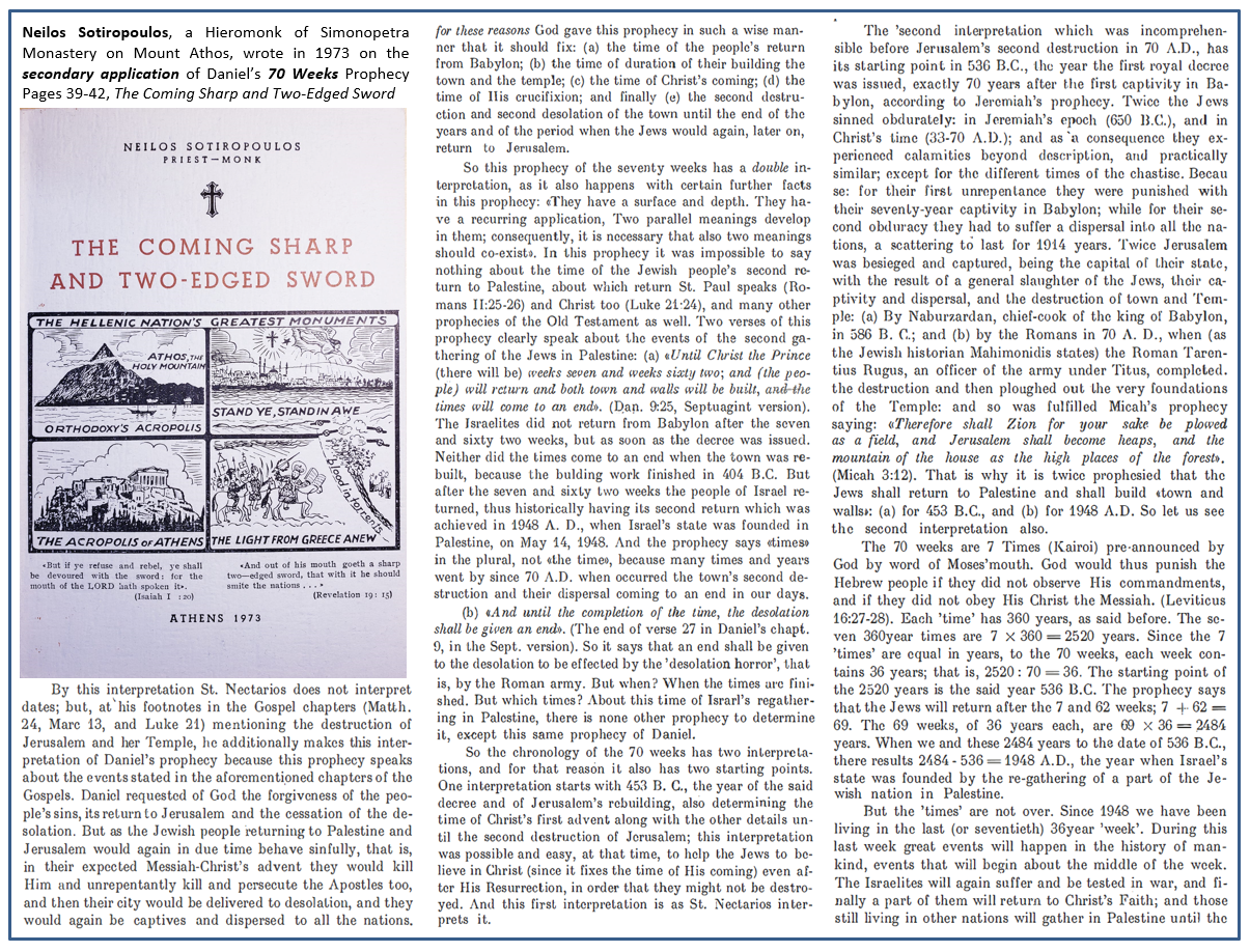 Daniel’s Seventy Weeks form the backbone of Sotiropoulos’ eschatology. He interprets them as a continuous historical span, not a fragmented scheme interrupted by a prophetic “gap.” In his reading, the weeks extend from the Persian decrees through the First Advent of Christ, continue through the long age of ecclesial struggle, and culminate in the collapse of hostile powers and the vindication of Orthodoxy.⁵
