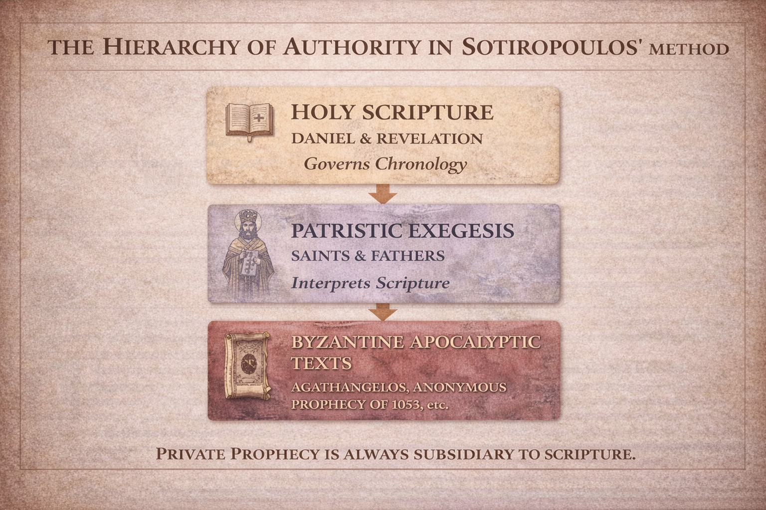Throughout this discussion, Sotiropoulos maintains a clear methodological hierarchy: Daniel establishes the chronology, Revelation confirms it symbolically, and Byzantine prophecy corroborates it secondarily. Private prophecy is never permitted to govern Scripture, but may function as historical testimony when it converges coherently with biblical chronology and lived ecclesial history.¹⁵