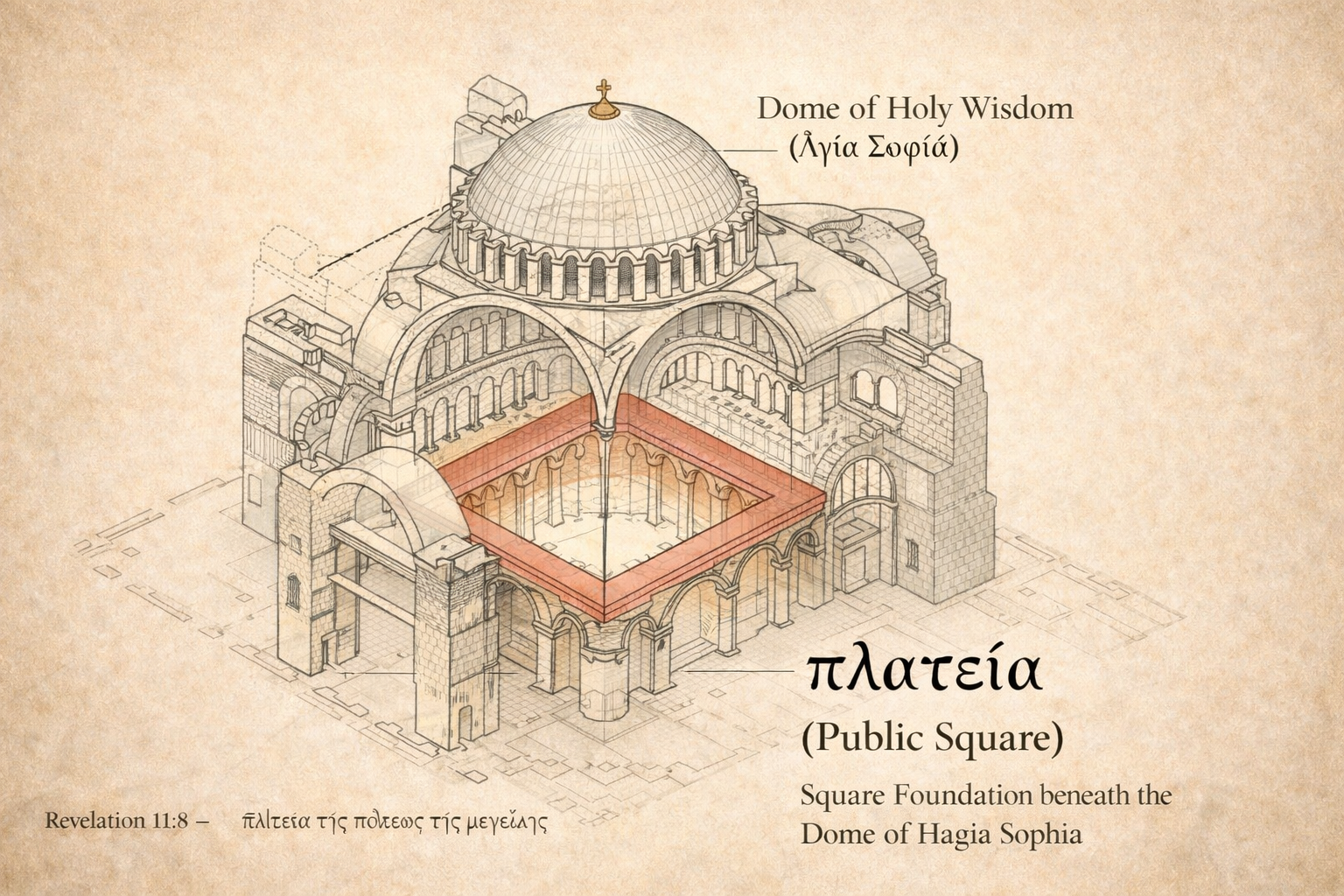 Architecturally, this square is not marginal or hidden; it is the most exposed and determinative space of the building. It gathers the assembly, supports the dome, and renders the interior a single unified public volume. In this sense, Hagia Sophia embodies in stone what Revelation 11 depicts symbolically: a public ecclesial space where witness is rendered visible, where judgment occurs, and where apparent defeat is displayed before rulers and nations. The πλατεῖα of the Great City is therefore not merely metaphorical; it corresponds strikingly to the square foundation beneath the dome of Holy Wisdom, the most public and theologically charged space of Constantinople.¹⁹