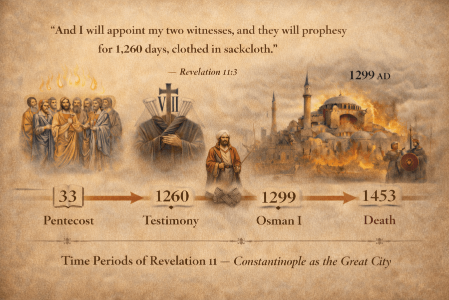 The Beast does not interrupt the testimony; it arises after the testimony is complete. This permits, and indeed encourages, an ecclesial starting point at Pentecost, when the Church first receives the Spirit and begins public witness (Acts 2). From Pentecost (c. AD 33), a span of approximately 1,260 years reaches the late thirteenth century, coinciding with the emergence of Ottoman power as a distinct polity (c. 1290–1299). The decisive public silencing of that witness culminates in 1453, when Constantinople falls and the Church’s conciliar voice is crucified in history.⁶