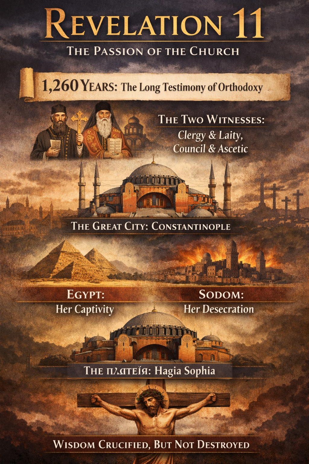In this light, Constantinople and Hagia Sophia emerge not as incidental backdrops, but as providential stages upon which the drama of Revelation 11 is enacted. The square foundation beneath the dome of Holy Wisdom, the completion of conciliar testimony, the long period of oppression and apparent silence, and the promise of renewed life together form a coherent ecclesial narrative. Orthodox Historicism therefore does not impose meaning upon the Apocalypse; it receives the text as a revelation of how Christ continues to act in and through His Church within history. Revelation 11, rightly understood, proclaims that the Church’s suffering is real, her witness costly, and her apparent death public—but that her resurrection, like her Lord’s, is assured by God and revealed in due time.
