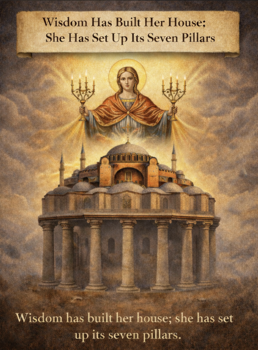 The sapiential key to this identification is given explicitly in Scripture: “Wisdom has built her house; she has set up its seven pillars.” (Prov 9:1). Within the Christian tradition, Christ Himself is confessed as the Wisdom of God (1 Cor 1:24), and the Church is understood as His house, built and ordered through divine wisdom rather than human power. Patristic and Byzantine exegesis consistently receive this passage not as poetic ornament, but as theological architecture: Wisdom establishes her dwelling through order, stability, and completeness.²⁰