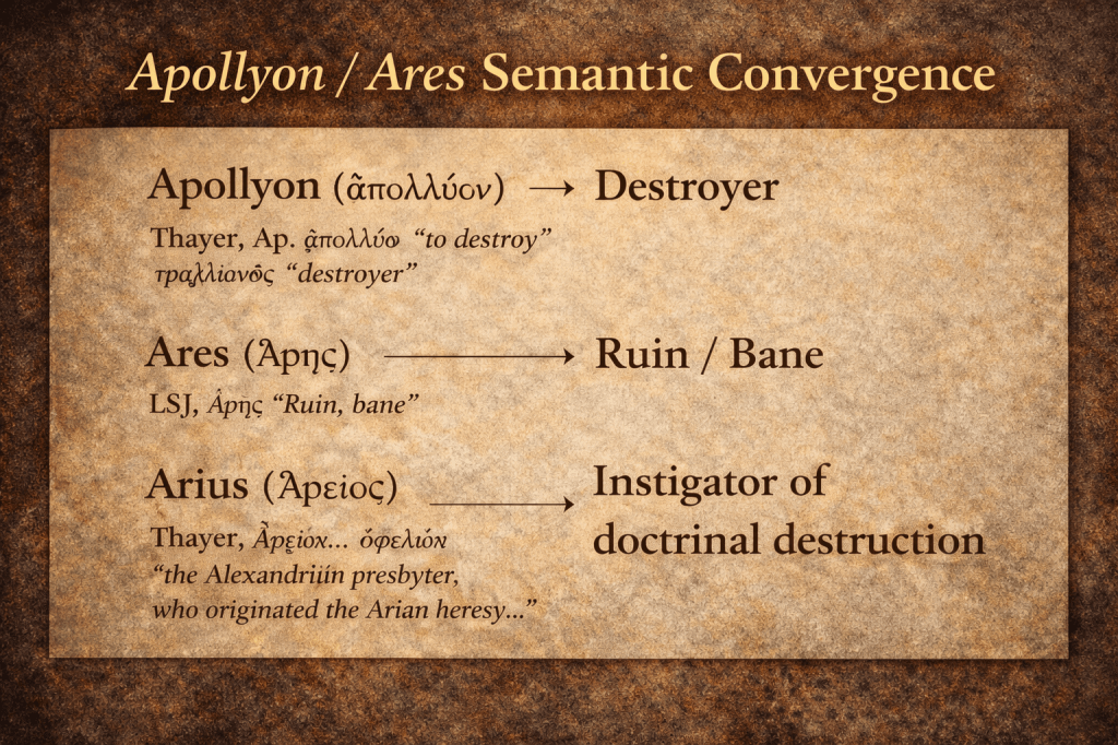 The Apocalypse’s title “Apollyon”—Destroyer—thus finds a historically intelligible embodiment in the Arian crisis. The parallel rests not on phonetic coincidence but on shared theological meaning: