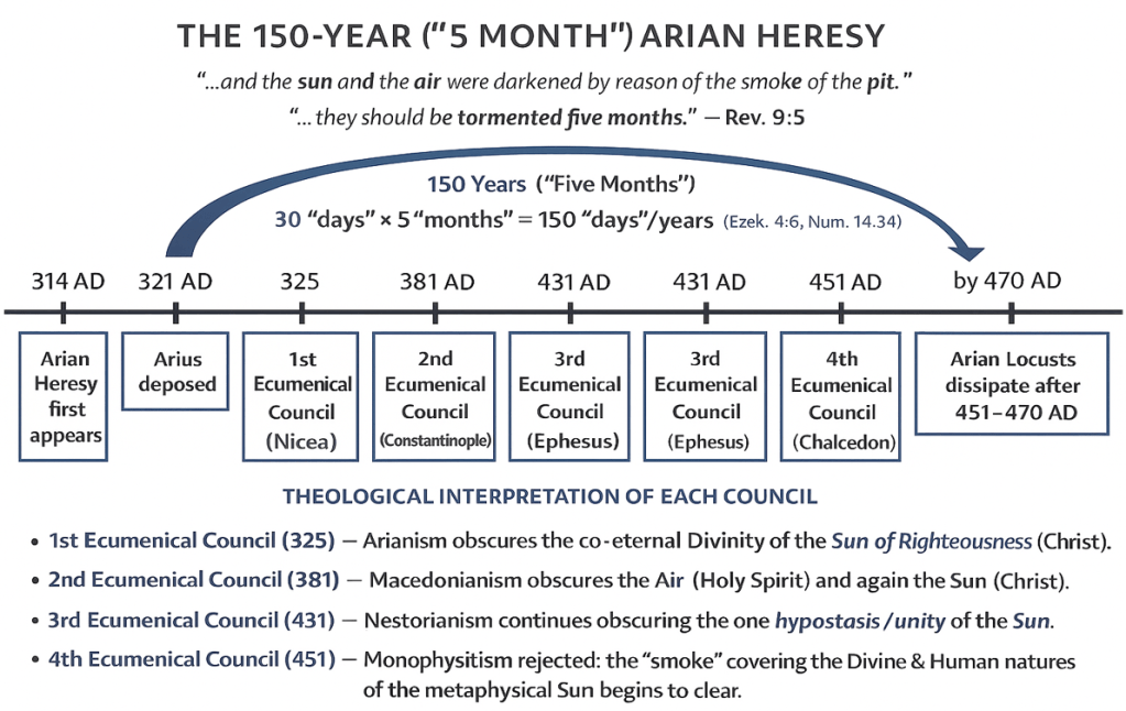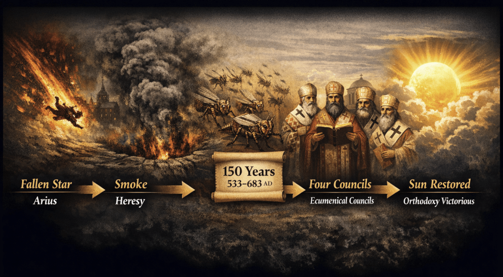 The Fifth Trumpet, read through an Orthodox Ecclesial Historicist lens, is not a prophecy exhausted in the siege of Jerusalem nor a vision of distant futurist catastrophe. It unveils the Church’s first great Christological woe: a measured period in which the confession of the Son was obscured, contested, and purified. The fallen star signifies the rise of doctrinal distortion; the smoke darkens the Sun and the Air—the revelation of the Son Jesus Christ and the Holy Spirit; the locusts torment the ecclesial body; and the five months mark a defined and measurable epoch of theological crisis. The councils wage war in heaven. The desert becomes refuge.