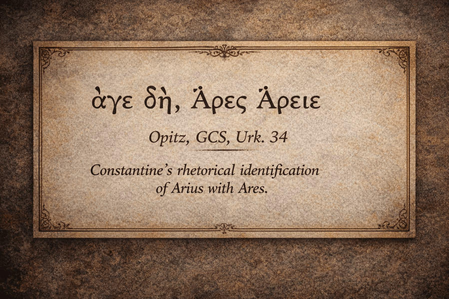 The play on words is unmistakable. Arius (Ἄρειος, Areios) is addressed as Ἄρης (Ares), the Greek god of war. Constantine thus associates Arius with conflict, agitation, and destructive strife within the Church.