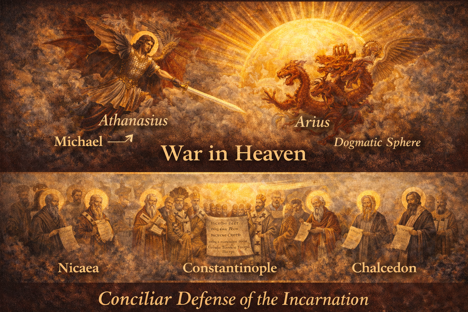 The Apocalypse portrays a dragon cast down through heavenly conflict. In historical reality, the “war” against Arianism was waged through creeds, exiles, pastoral letters, and ascetic endurance. The councils functioned as the Church’s Michaelic counterstroke: the defense of the Incarnate Son against a doctrine that sought to reduce Him to creaturehood.