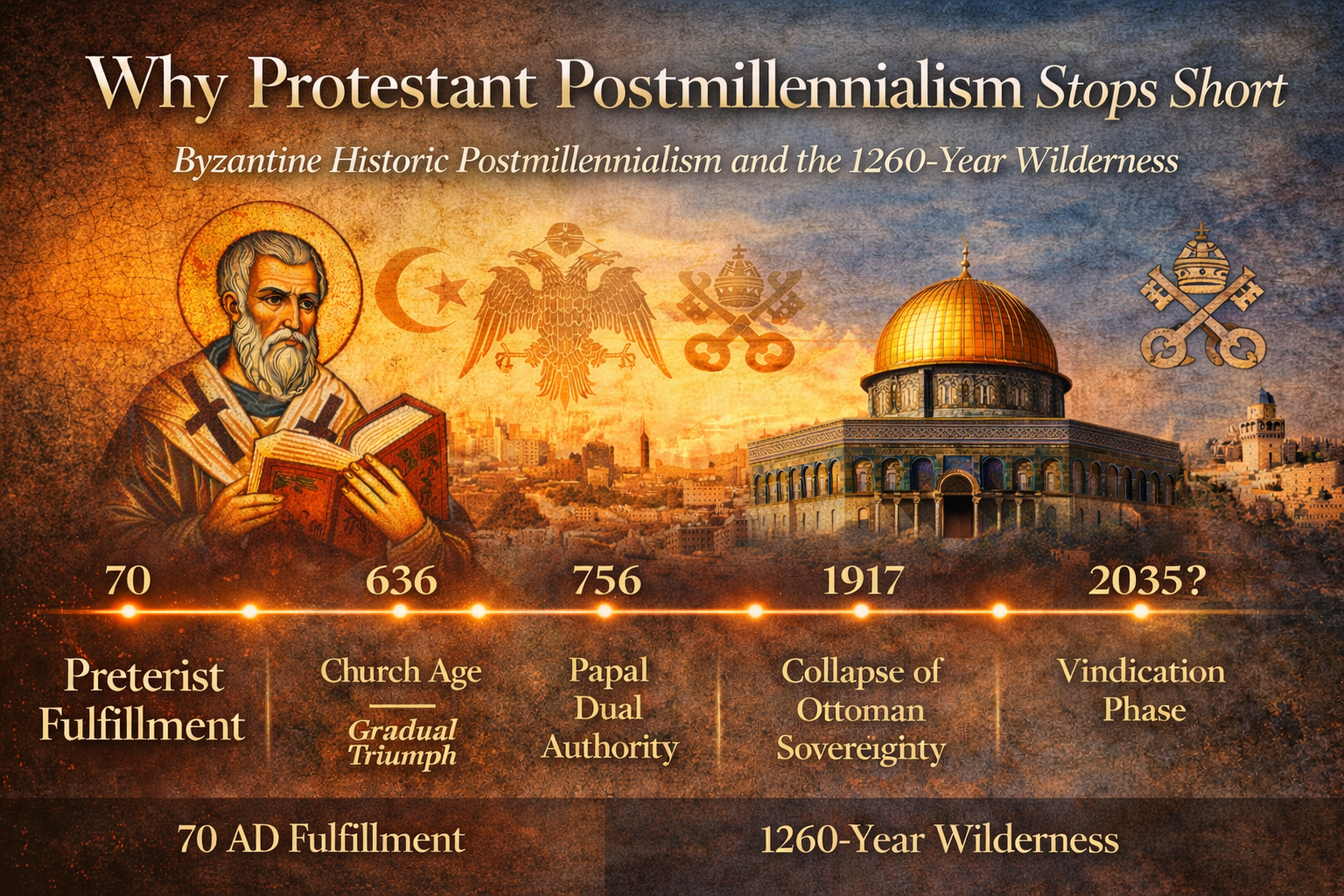 Byzantine Historic Postmillennialism, by contrast, allows Revelation 12–13 to unfold across extended historical epochs. The 1260 days signify not merely a three-and-a-half-year persecution, but a prolonged wilderness condition in which the Church survives under successive religio-political pressures. Islam, Papal temporal sovereignty, imperial iconoclasm, and modern secularization are not extraneous to the apocalyptic narrative; they are structurally integrated within it.