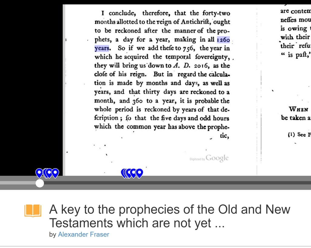 Fraser, in A Key to the Prophecies of the Old and New Testaments (1806) applies the day-year principle to the 42 months and identifies 756 as the year Papal temporal sovereignty began, yielding a prophetic terminus around A.D. 2016 when reckoned in 360-day prophetic years.¹¹ He writes: