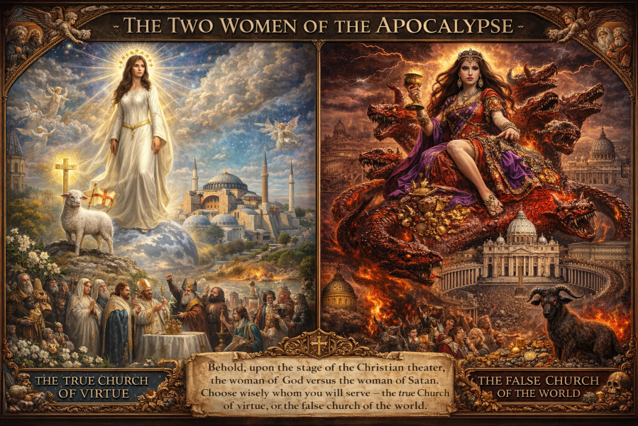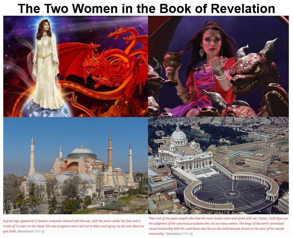The two rival women of the Apocalypse are symbols of the two Christian Churches-the Eastern and the Western. The woman clothed with the sun, carrying upon her head the crown of twelve stars and having the moon under her feet, is the symbol of the Eastern Orthodox Church, which, after giving birth to the man-child, took refuge in the desert, fleeing from the face of the dragon enraged against her; whereas the woman seated upon many waters and upon the seven heads of the beast and appareled like an earthly queen in purple and gold, precious stones and pearls, is the symbol of the Latin Church with whom the kings of the earth committed fornication and with the wine of the wrath of whose fornication the inhabitants of the earth were drunk. He, then, who wishes to know the essence and the nature of each church and the existing difference between these two Christian Churches may look at the pictures and images by which the Holy Spirit has described and characterized both the nature and the achievement of each. We challenge the Latins of today to prove before the Christian world what woman’s children and offspring they are. Are they the children and the offspring of the woman clothed with the sun, who gave birth to the man-child and took refuge in the desert where she was sustained in her place for “a time, times, and an half,” that is, one thousand two hundred and sixty days? Or are they the children and progeny of the woman in purple sitting upon the seven mountains and ruling over the kings ‘of the earth? Which of the two lambs are they the followers of? Are they the followers of the true Lamb standing upon mount Sion, or of the apparent lamb sitting on the Capitol of Rome? The two women, the two lambs, and the two rival unions distinguish the kingdom of God from the kingdom of Satan. Satan has reigned over mankind through a woman, and so has God (…).”
